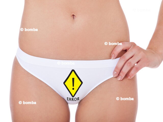 Nohavičky s nápisom Error - veľkosť L sú klasické biele nohavičky so žltým kosoštvorcom s výkričníkom a výstižným nápisom "ERROR". Vynikajúci darček pre každú priateľku, manželku alebo nebodaj milenku k sviatku. (Nohavičky na obrázku sú iba ilustračné, vtipný obrázok je originálny.)